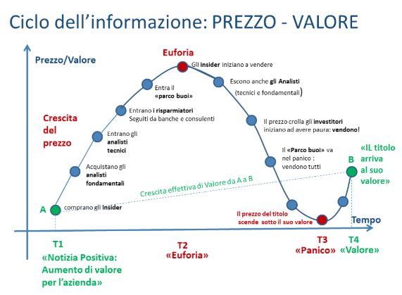 C’è un grafico che riassume in modo perfetto la psicologia dell’investitore medio: il ciclo dell’informazione Prezzo–Valore. Rappresenta cosa accade ogni volta che una notizia positiva accende l’interesse per un titolo o un settore.